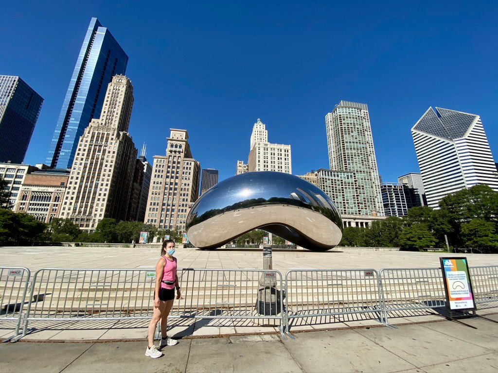 That evening we met Thomas and Ashley for dinner while watching the Bucks suffer a maddening last second defeat. Our spirits were lifted slightly the next morning when we were able to get out on a morning run to Millennium Park. To encourage social distancing and mask wearing, there was a monitored entrance into the park and the Bean was blocked off, but we still made a quick photo stop.