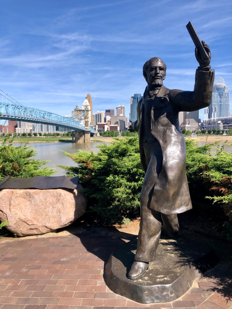 Our walking tour commenced later that morning just steps from our hotel on the Kentucky side of the Ohio river. While Rob and Natalie imparted their Cincinnati knowledge, we strolled past several of the bronze statues of area historical figures along Covington’s riverfront. When it was time to explore Cincinnati proper, we crossed the pedestrian only Purple People Bridge to Sawyer Point and were greeted by statues paying homage to the city. The larger of the two is of Lucius Quinctius Cincinnatus, a dictator in the early Roman Republic and the city’s namesake. The smaller, more comical statue is of a winged pig in Roman gladiator attire – an homage to Cincinnatus and representative of the city’s other nick name, Porkopolis. As residents of the Dairy State who have seen our fair share of colorful cow sculptures over the years, we could appreciate the sentiments.