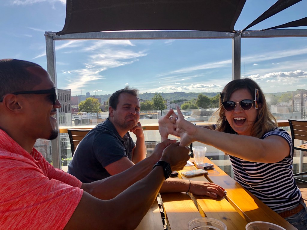 Our walk concluded back in Covington, but we were just getting started on our “taste of Cincinnati” as we headed to the Over-the-Rhine neighborhood, named as such for its large population of German immigrants who settled the area in the mid-19th century. Our first stop was Graeter’s for their famous black raspberry chocolate chip ice cream. Afterwards we settled in at a table on the spacious rooftop of Rhinegeist Brewery and Dan and I finally learned to play the card game Euchre.