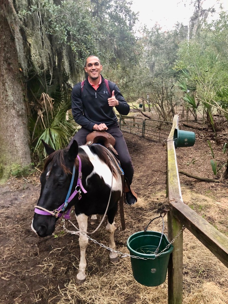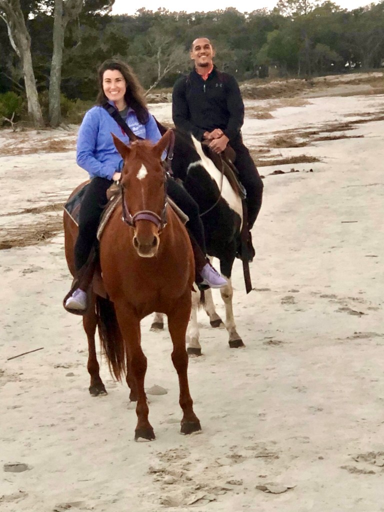 As the sun descended in the sky, we mounted our bikes and pedaled the last stretch of trail to the northernmost point of the island in anticipation of my birthday surprise – a horseback ride on the beach at sunset. This is not the first time Dan has surprised me with a fun activity for my birthday, but it was his first ever time horseback riding. It’s been a while since I last sat on a horse, but my trusty steed, April, was mostly calm, her defiance only incited by a desire to snack on the occasional shrub along the trail, for which I can’t fault her.